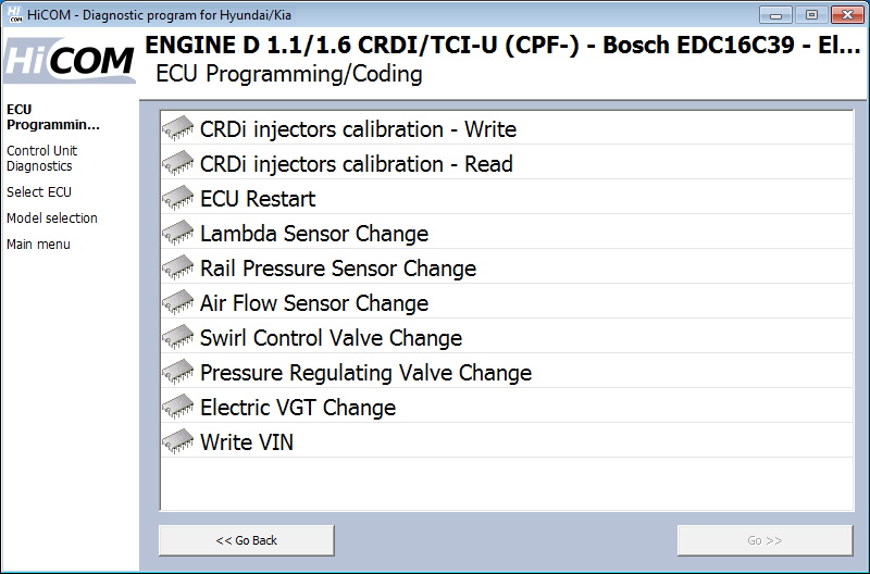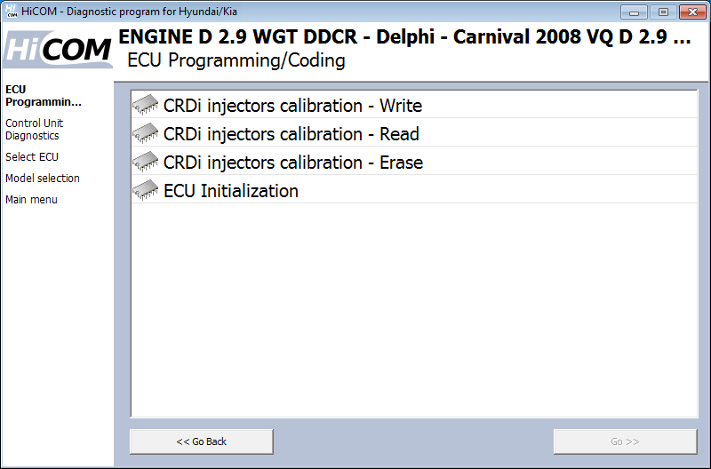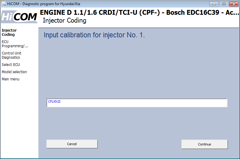 La calibrazione dell'iniettore CRDi è disponibile nel menu "Programmazione/codifica ECU" dopo il collegamento alla centralina del motore diesel.