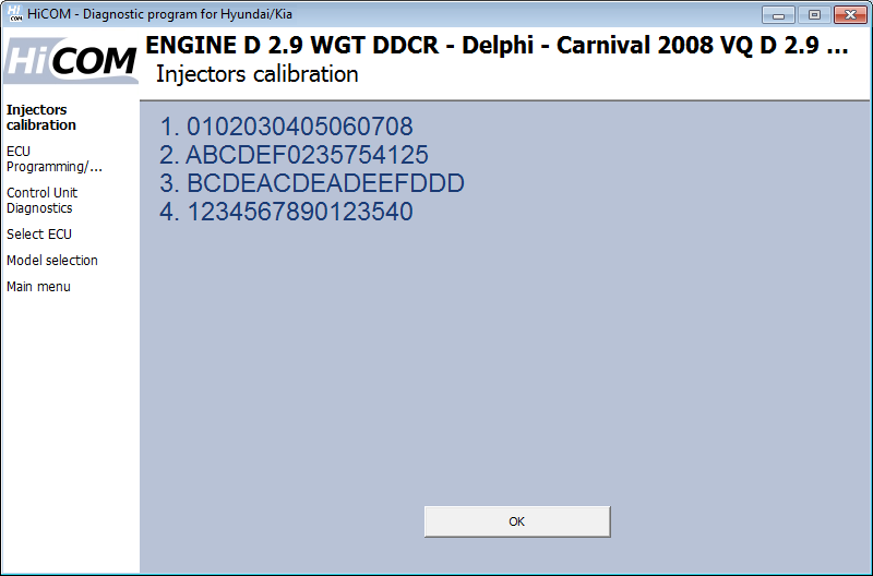 Esempio di numeri di calibrazione inseriti nell'unità di controllo Delphi DDCR sul bus KWP2000. Per ciascun iniettore viene inserito il numero di calibrazione di 16 cifre, contenente lettere e cifre.