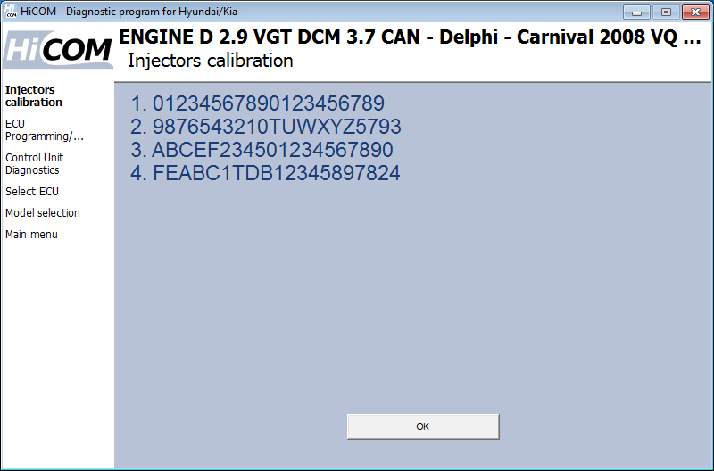Esempio di numeri di calibrazione inseriti nell'unità di controllo Delphi DCM su CAN bus. Per ciascun iniettore viene inserito il numero di calibrazione di 20 cifre, contenente lettere e cifre.