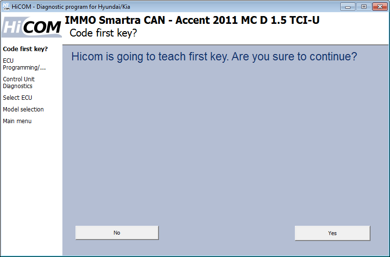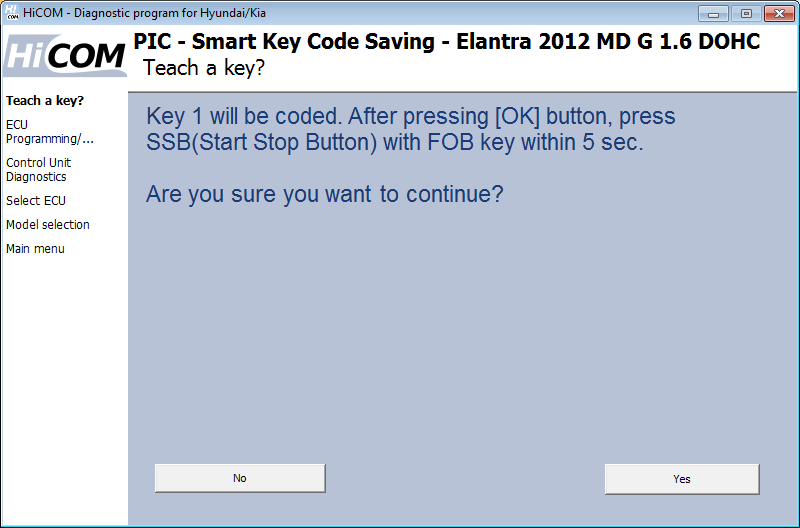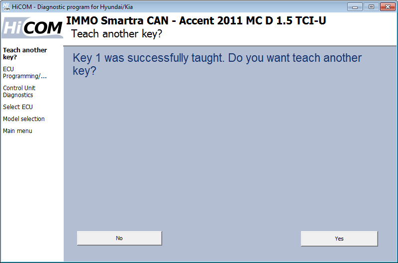 Ti verrà chiesto se desideri codificare un'altra chiave. Se fai clic su "Sì", HiCOM ti chiederà di inserire la chiave successiva. È possibile codificare fino a 4 chiavi (alcune centrali consentono centraline fino a 8 chiavi). Se si fa clic su "No", il processo di codifica viene interrotto e non vengono aggiunte altre chiavi.
