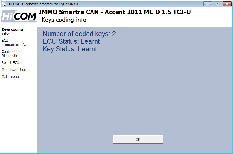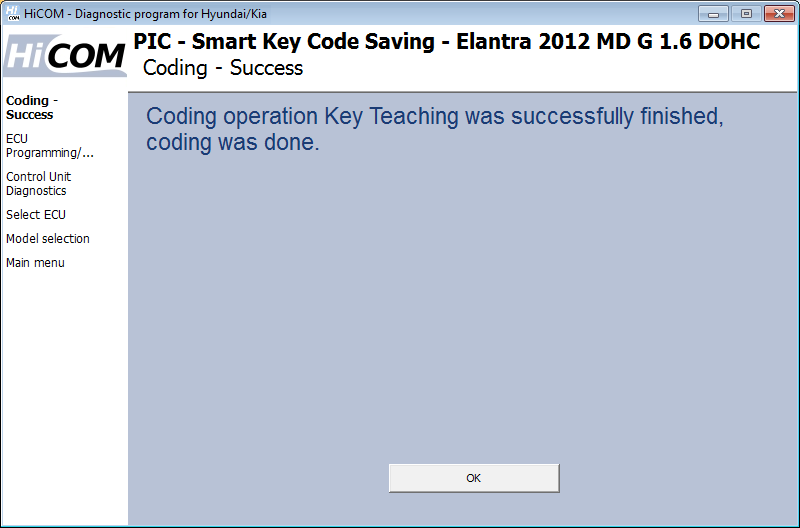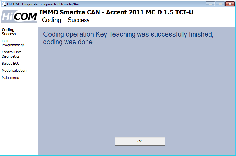 Una volta completata l'operazione di codifica, HiCOM visualizza le informazioni sulla codifica riuscita.